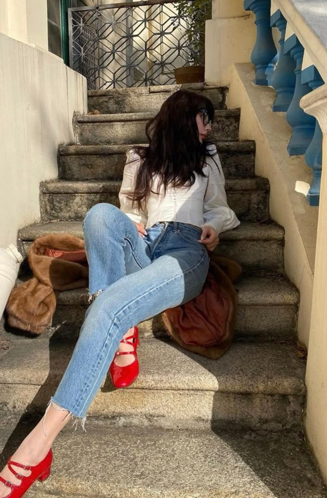 Dark denim, fitted jacket, clean sneakers/loafers